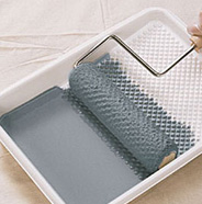 Pour paint into a paint tray and work the roller into the tray until it is fully loaded with paint. For best results, use a ½"-1" roller cover.