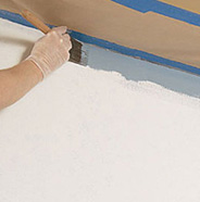 With your brush, paint (cut in) around the perimeter of the wallpapered surface. Start at a top corner and continue along the ceiling and around the baseboards.