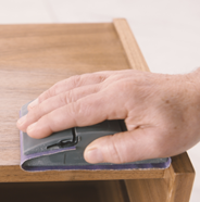 To prep the surface, gently sand the wood with a sanding block and 220 grit sandpaper, then give it a wipe with a lint-free cloth to remove all dust.