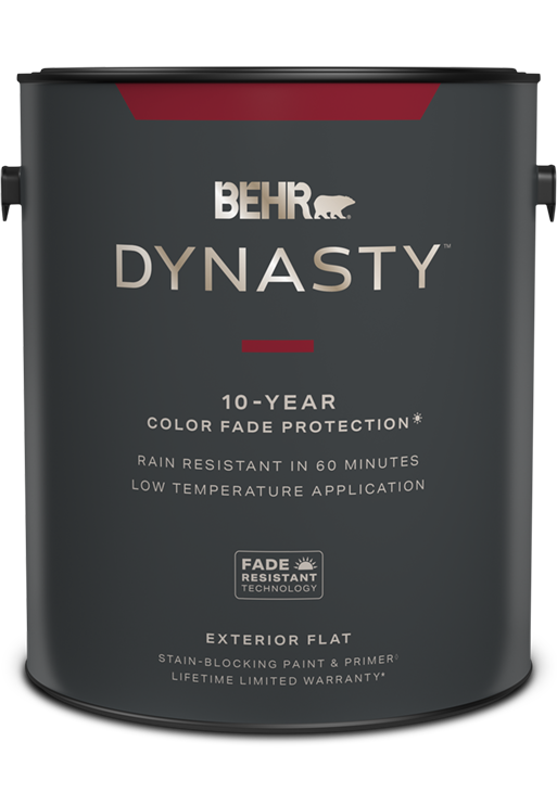 **Valid only when tinted to colors from the BEHR DYNASTY® specially curated Exterior Color Fade Protection Palette. Based on predictive lab testing with a color shift less than Delta E of 5 as measured by CieLAB. A primer coat may be needed. Two coats of BEHR DYNASTY® Exterior Paint are recommended for optimal durability. Individual results may vary. See back label instructions for details and warranty limitations.
