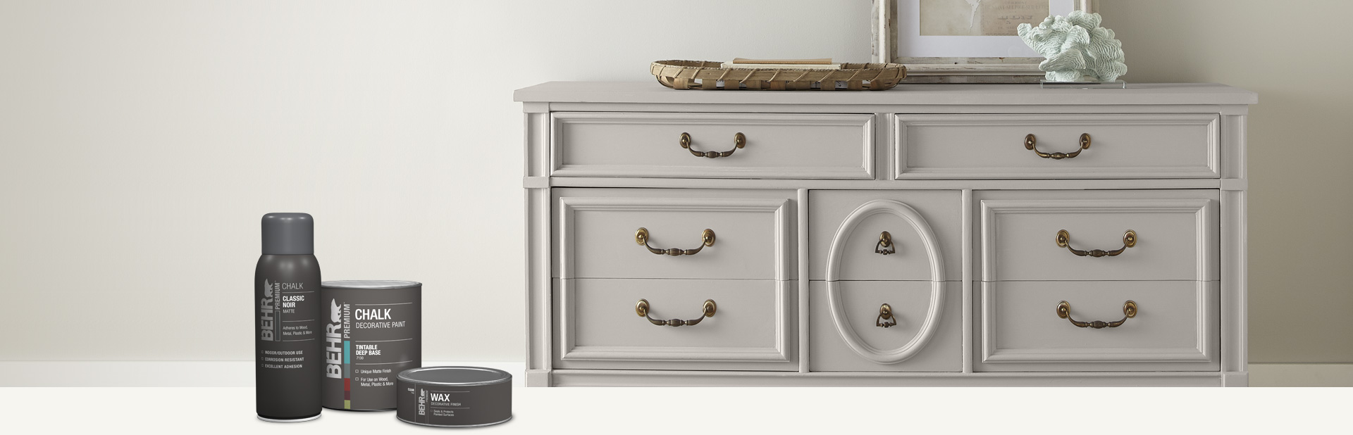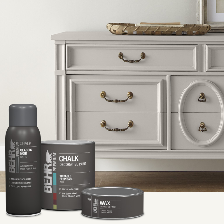 BEHR PREMIUM Chalk Decorative Paint and Wax pair together to create a velvety, matte finish customizable to a distressed, satin, or antique look.