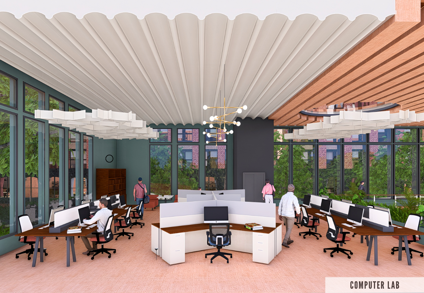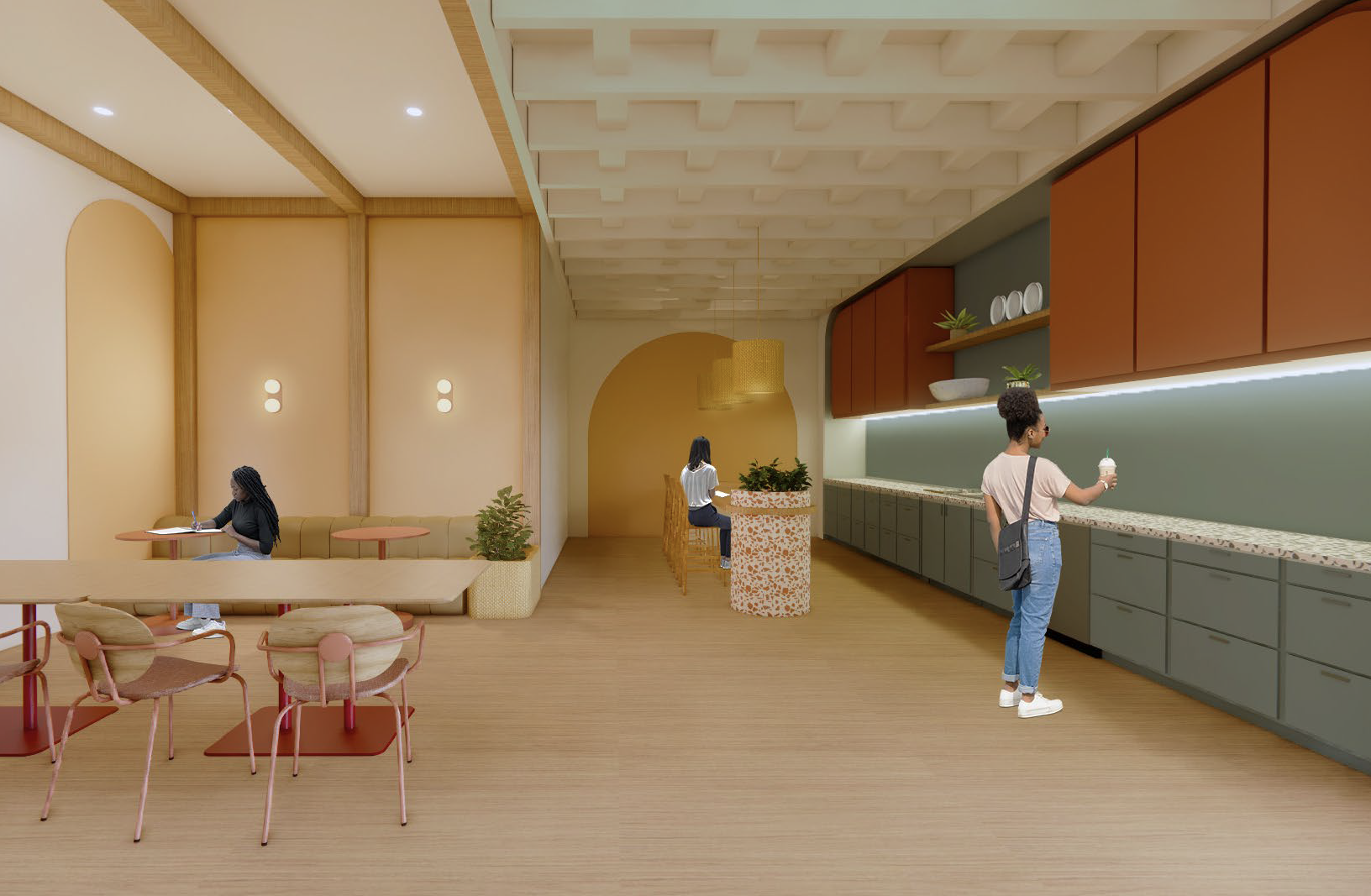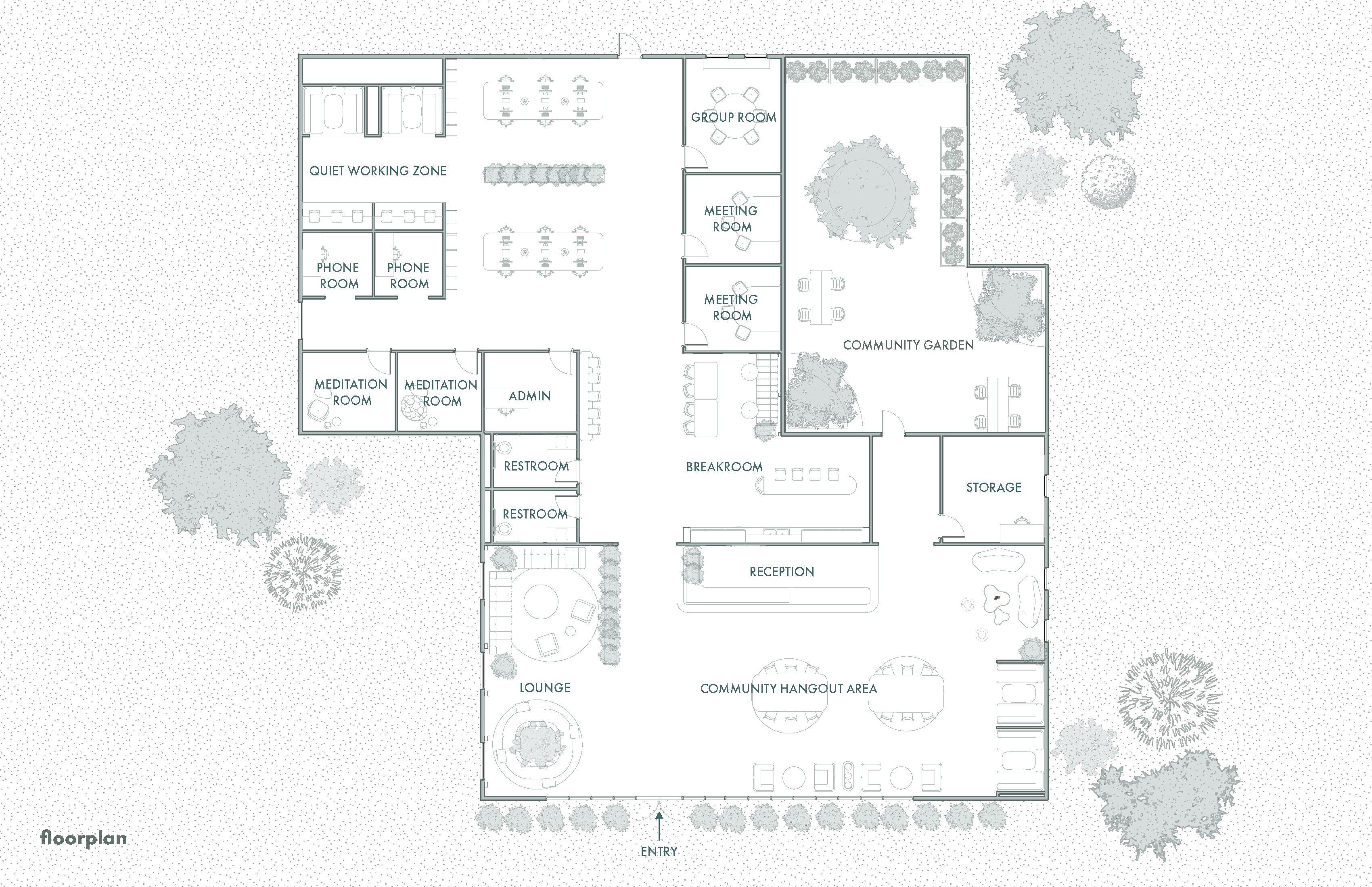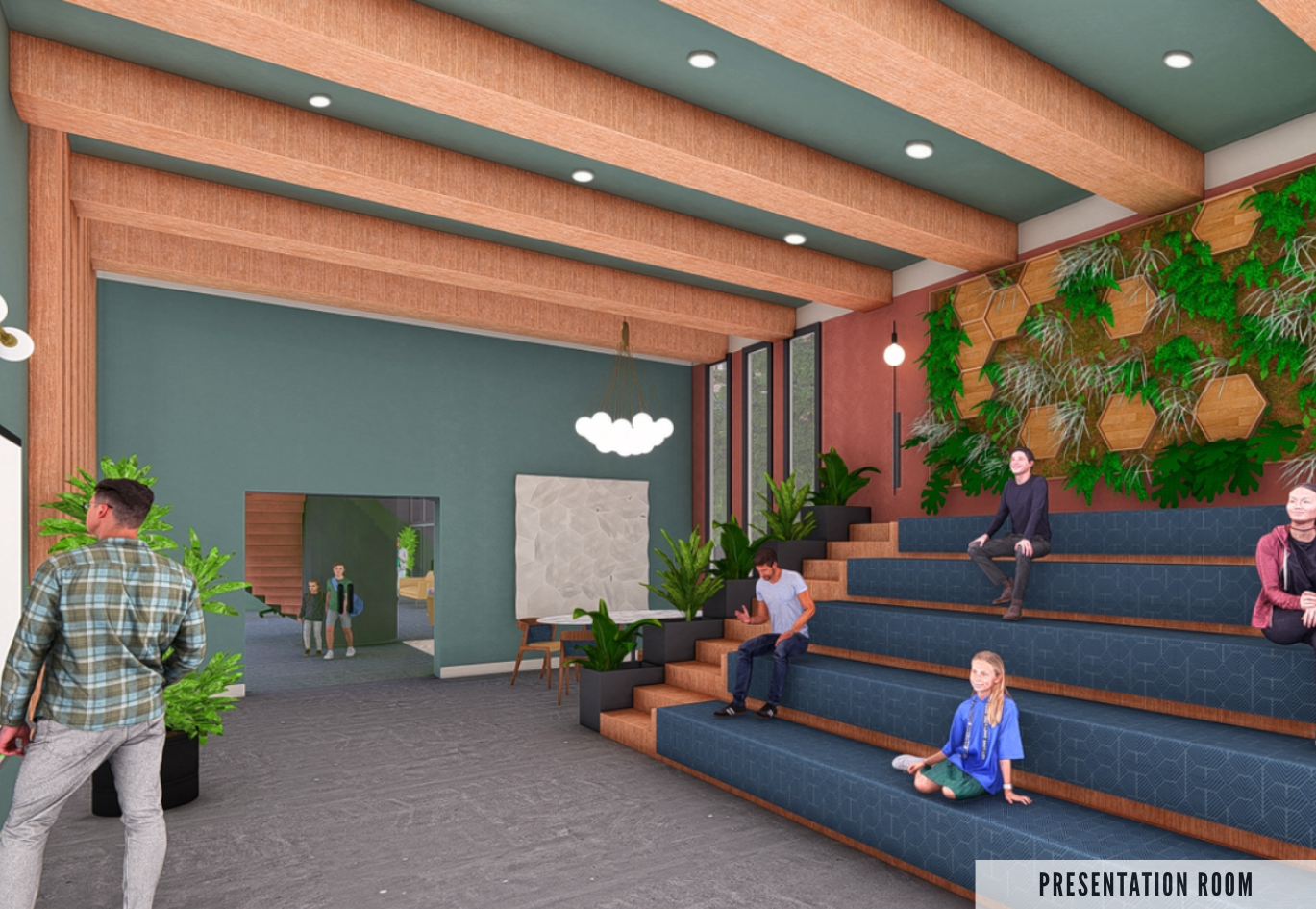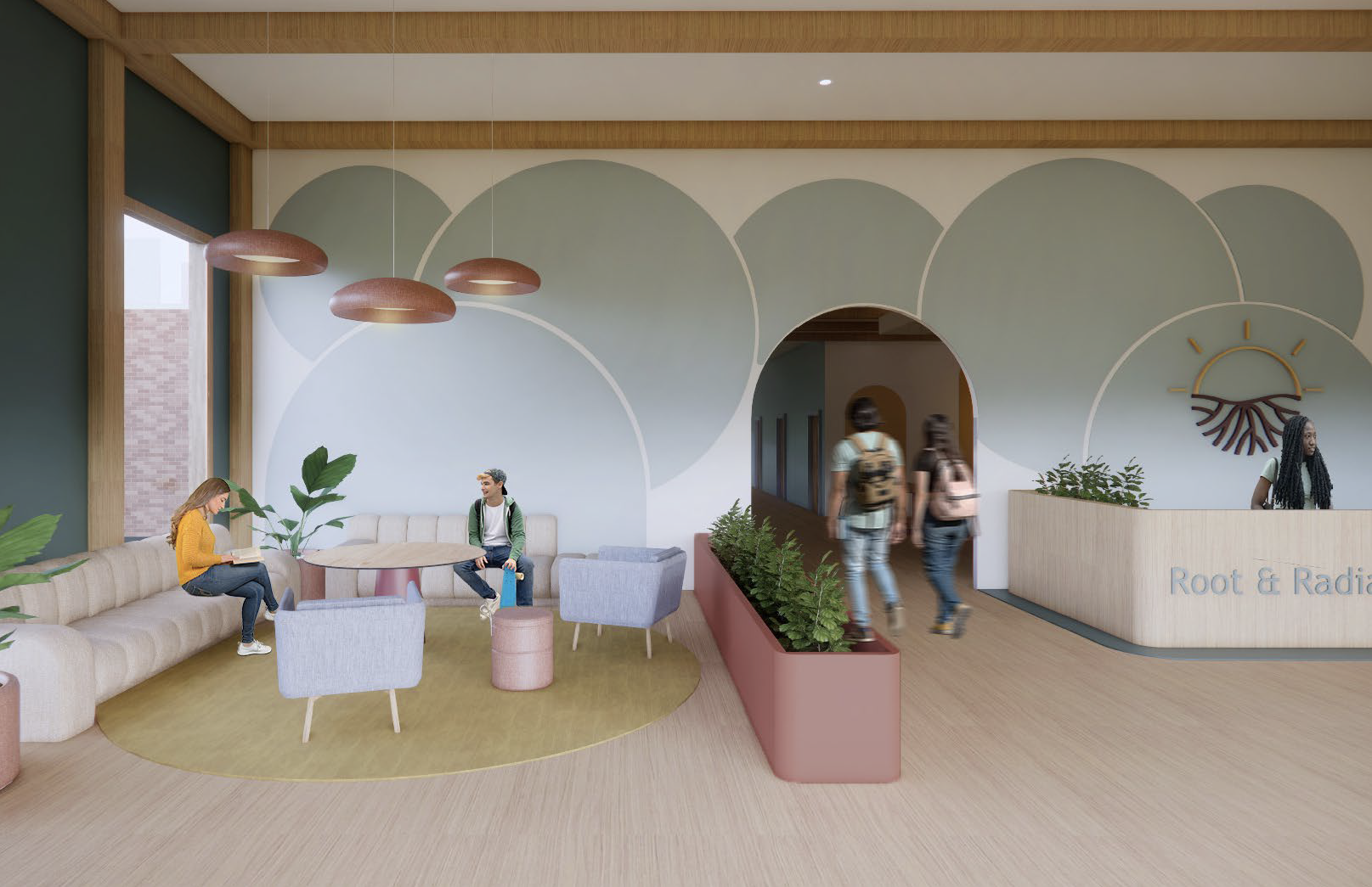 In 2025, many young people lack spaces designed to support their transition into adulthood. Influenced by social media and adult-centered environments, adolescence has become fleeting. The Root & Radiance Center is a youth development hub that bridges this gap—balancing playfulness with sophistication. "Root" symbolizes grounding, maturity, and foundation, while "Radiance" represents growth and emerging confidence. Drawing inspiration from BEHR's 2026 Color Trends and the theme "Beyond the Expected," the design embraces saturated yet harmonious hues that mirror the duality of youth—vibrant yet composed. Shades of calming jade, warm terracotta, and soft neutrals create an atmosphere that feels both grounding and uplifting. Each space, ranging from collaborative lounges to quiet reflection zones, encourages self-expression, empathy, and connection. Spatial planning emphasizes openness and community-centered areas near the entrance, gradually transitioning to private zones for one-on-one meetings and focused work. Color choices carry emotional intent: the Color of the Year, Hidden Gem N430-6A, serves as a grounding accent exuding maturity and confidence. The breakroom's Beehive M270-5 energizes users with optimism, while the meditation room's Urban Nature S380-3 fosters balance and calm. Through color, form, and atmosphere, the Root & Radiance Center becomes a refuge for growth, confidence, and self-discovery.