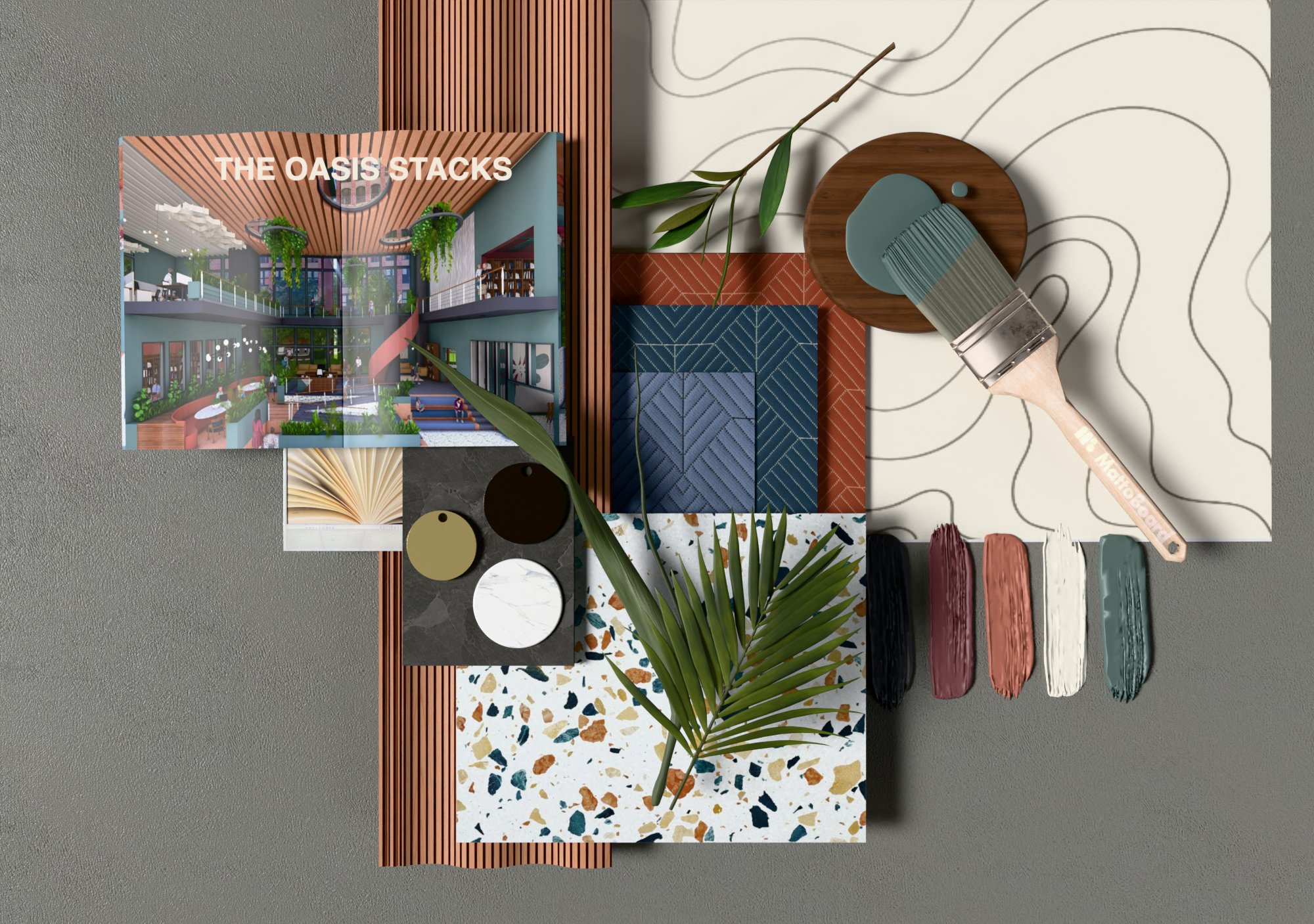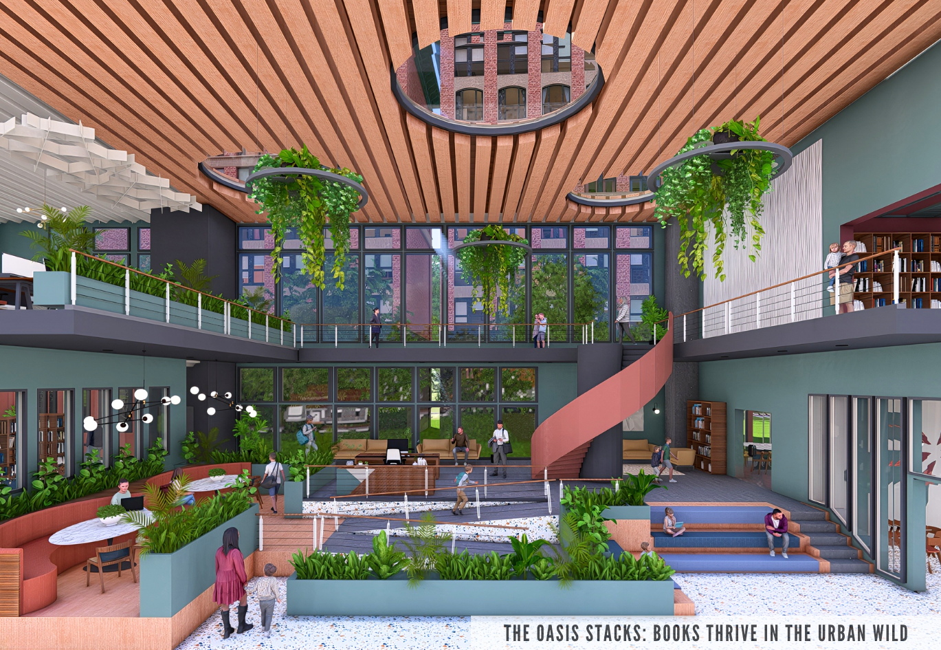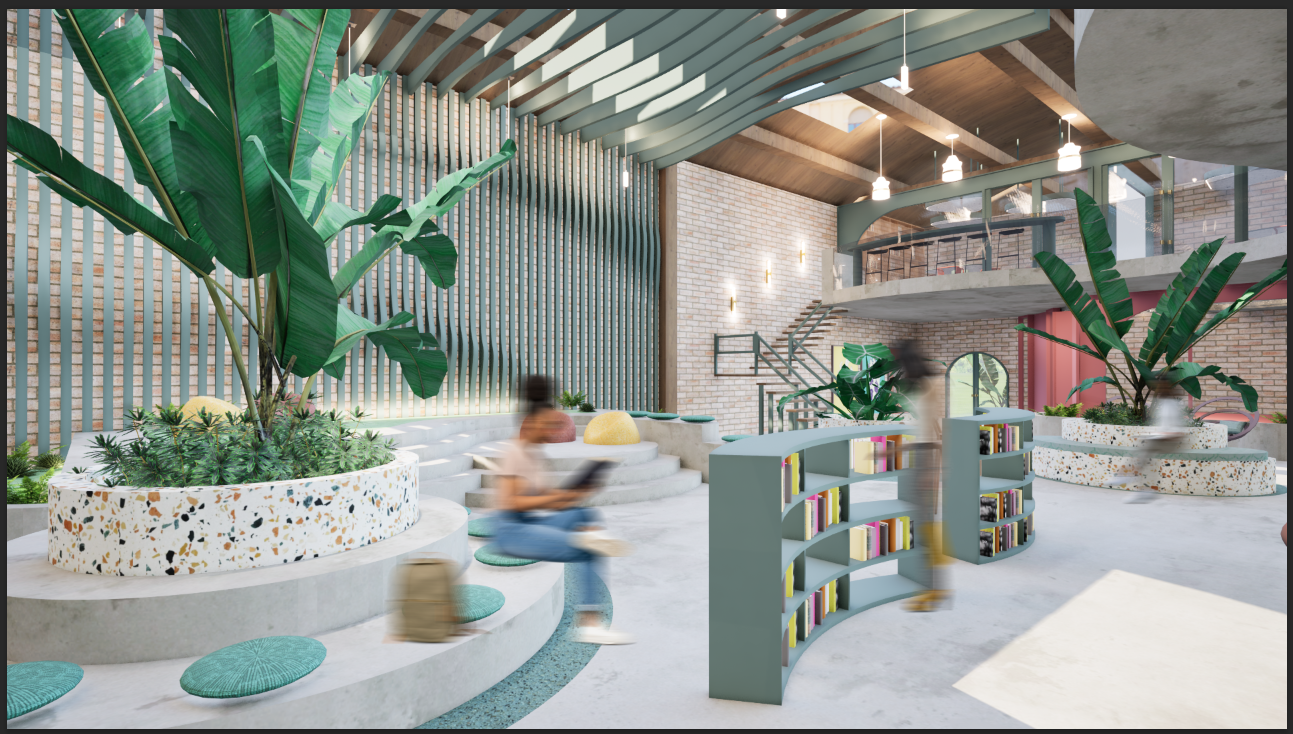 The Oasis Stacks serves as an Urban Jungle Library, a biophilic retreat designed to offer city dwellers a peaceful and intellectually stimulating sanctuary. The overall concept focuses on creating a playful yet grounded balance between the built environment and nature, using color as the foundational tool for environmental immersion and user wellness. The color palette mainly consists of Terra Cotta Urn, Blank Canvas, Rumors, Cracked Pepper, and most Importantly Hidden Gem. Hidden Gem mimics the protective, lush canopy of a jungle and promotes a feeling of enclosure and focus. Terra cotta urn helps ground the space evoking the warmth of clay and rich soil, while Blank Canvas provides an airy contrast to help keep the space light. Rumors creates moody alcoves meant for quiet reflection, while Cracked Pepper ties the space together by defining the architectural structure, providing the necessary "urban" contrast which makes this space unique. This intentional color layering transforms the space into a warm, immersive, and inherently restful environment.