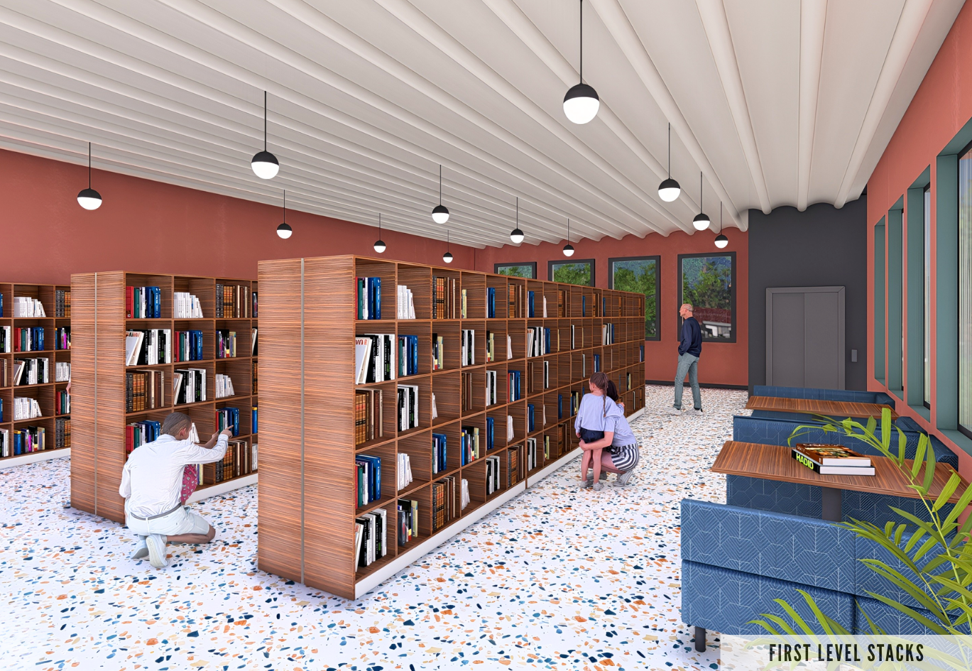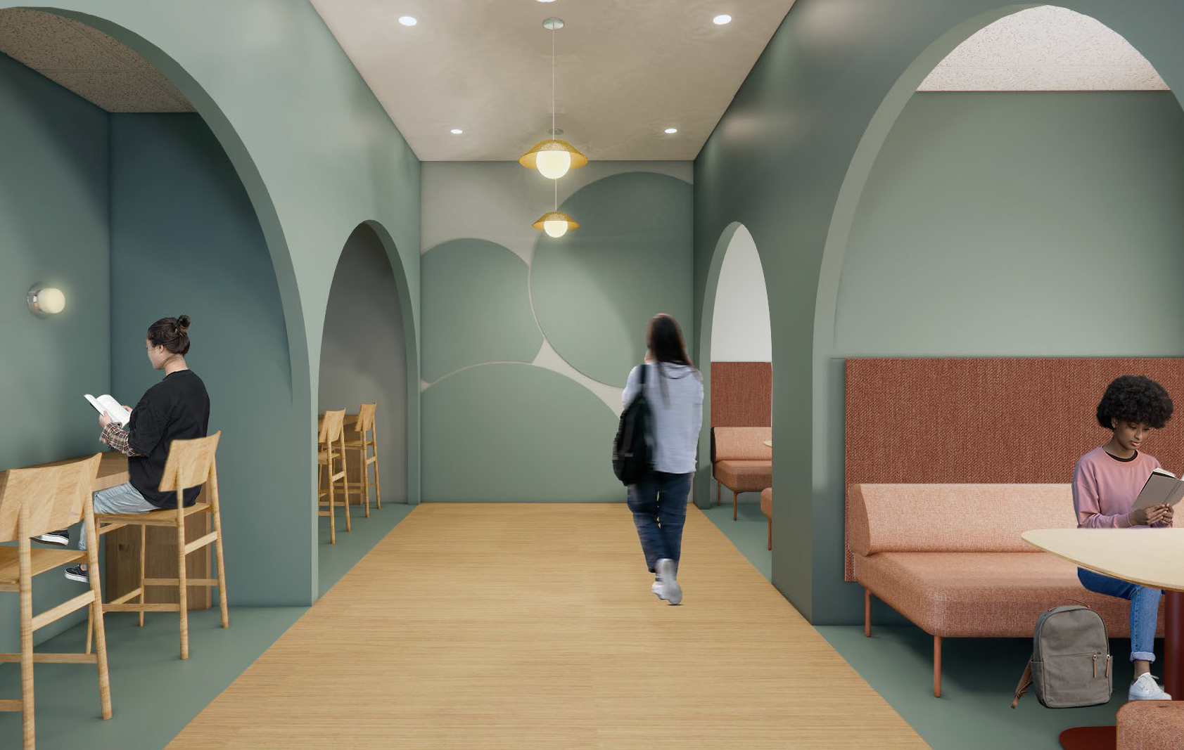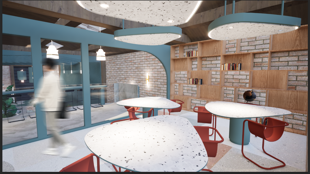 The Oasis Stacks serves as an Urban Jungle Library, a biophilic retreat designed to offer city dwellers a peaceful and intellectually stimulating sanctuary. The overall concept focuses on creating a playful yet grounded balance between the built environment and nature, using color as the foundational tool for environmental immersion and user wellness. The color palette mainly consists of Terra Cotta Urn, Blank Canvas, Rumors, Cracked Pepper, and most Importantly Hidden Gem. Hidden Gem mimics the protective, lush canopy of a jungle and promotes a feeling of enclosure and focus. Terra cotta urn helps ground the space evoking the warmth of clay and rich soil, while Blank Canvas provides an airy contrast to help keep the space light. Rumors creates moody alcoves meant for quiet reflection, while Cracked Pepper ties the space together by defining the architectural structure, providing the necessary "urban" contrast which makes this space unique. This intentional color layering transforms the space into a warm, immersive, and inherently restful environment.
