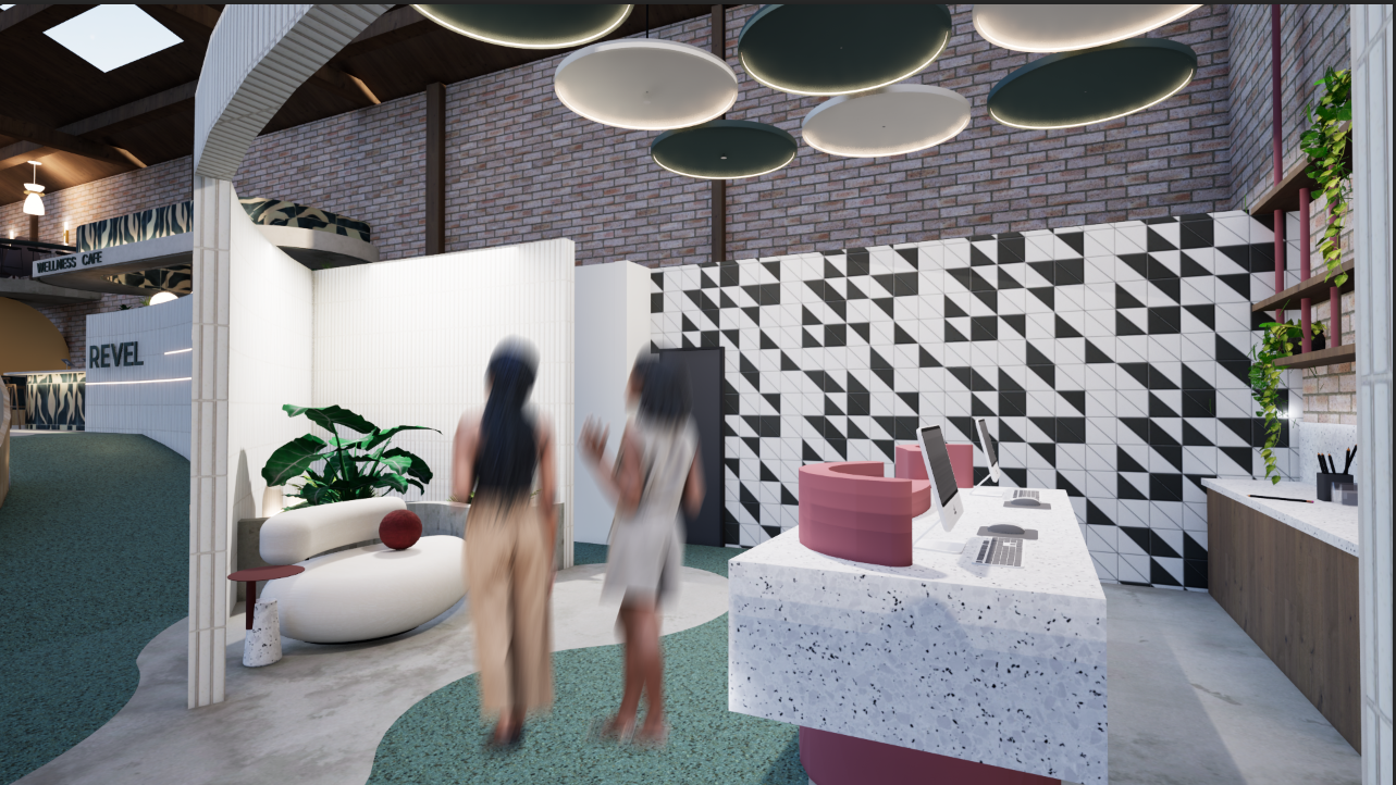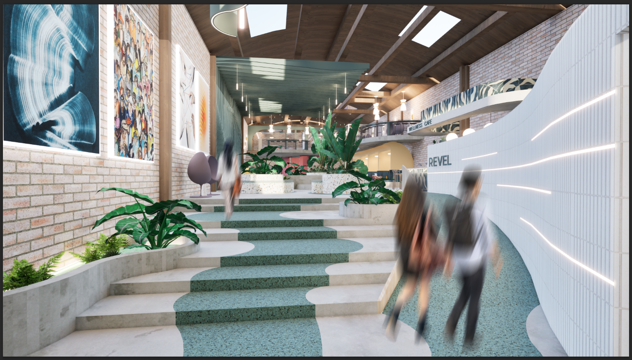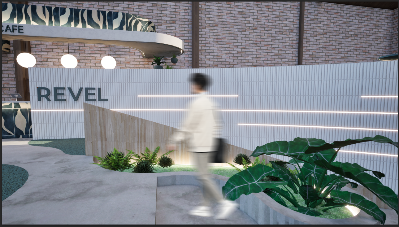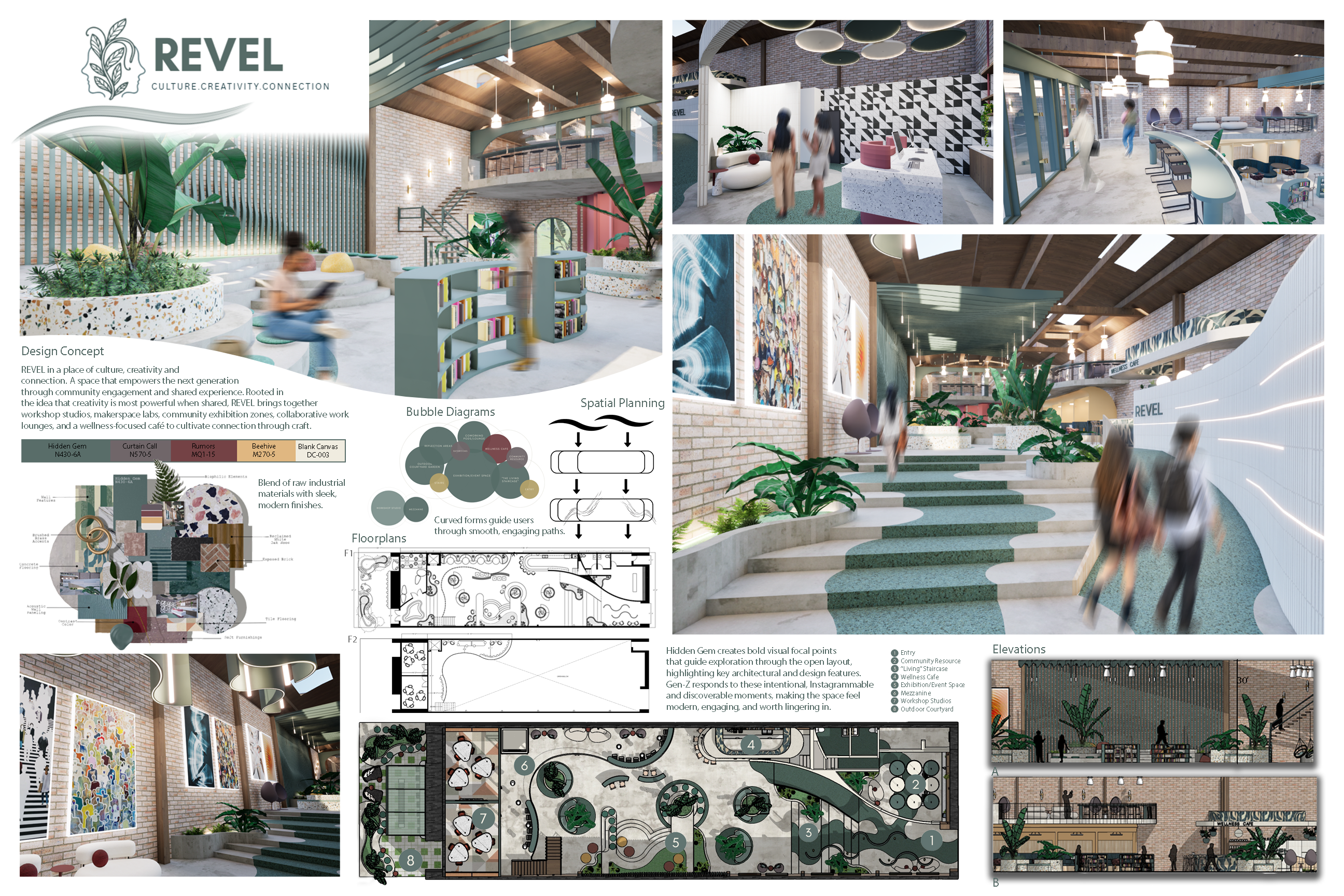 REVEL is a cultural hub where creativity, community, and connection converge to empower the next generation. Rooted in the belief that community grows stronger when shared, REVEL offers flexible, multipurpose spaces that adapt to the rhythms of everyday life. Community exhibition zones, open lounges, adaptable event areas, and a wellness focused café create an environment that supports social connection and creative expression. In the heart of LA's Fashion and Arts District, it invites young innovators to gather, make, and discover new possibilities together. Behr's Hidden Gem N430-6A anchors the concept, symbolizing the discovery of new perspectives within the community. In bright light, it reveals cooler blue undertones; in shadow, it deepens into a contemplative green mirroring the layered identity of LA culture. Rumors MQ1-15 adds contrast, while Curtain Call N570-5, Beehive M270-5, and Blank Canvas DC-003 introduce warm neutrals that soften the warehouse's industrial shell. The design preserves the raw character of the existing structure while elevating it with natural light, biophilic elements, reused materials, and curved pathways that echo the movement of ideas. A fully ADA compliant layout ensures accessibility for all. REVEL becomes a modern, "instagrammable" destination that sparks curiosity and encourages visitors to stay, explore, and connect.